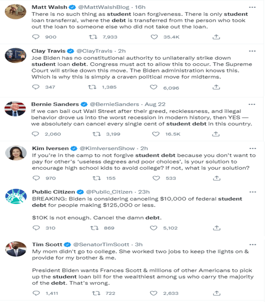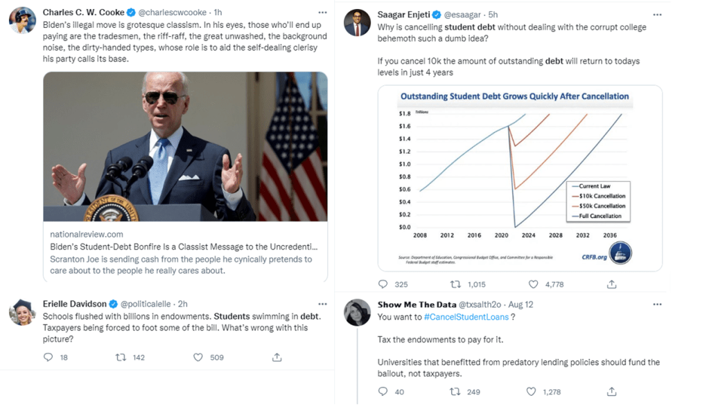 Even as someone who has shown a lean toward right-wing and conservative politics, both have great points on the problem with both sides. It is true, as a taxpayer I don’t want to pay your loan for your mistakes in education choices and the inability to get a job; also, as a former student, it is BS that I have to pay this money when I did the right thing, went to college, got a degree and the job market is not available – like why do I need a bachelors degree to work the line at a car factory? Both have a stake in their claim and if you say they don’t I am inclined to call you a liar because everyone has had this experience at one time or another, even the anti-debt cancellers. In searching for some middle ground ideas, I came across some tweets that I found captured my sense of the situation.