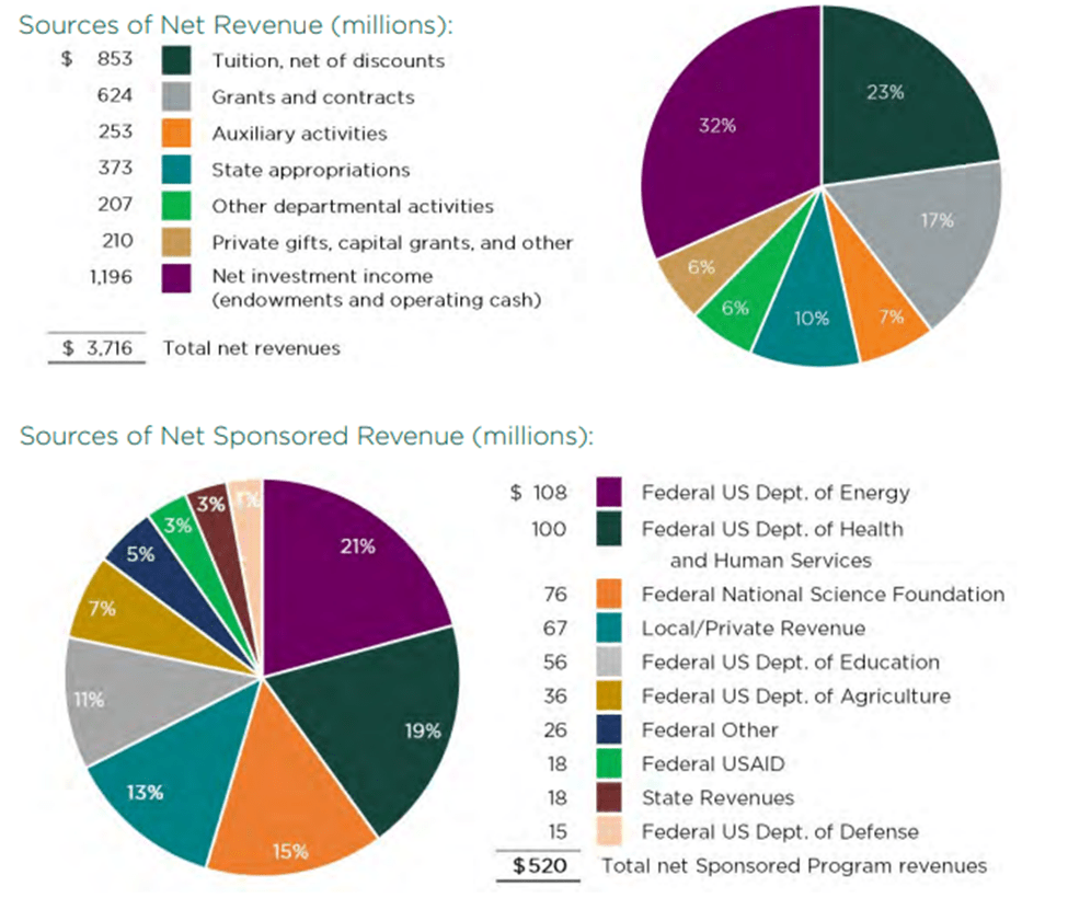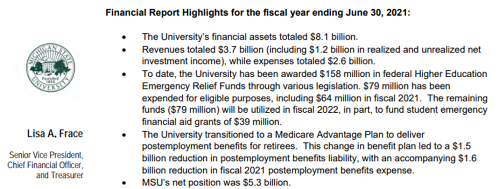 Not that I have any animus toward this school, but Michigan State University was the first school that came to mind and a public land-grant university would have the most information on its financials. On page 3 there is a statement from Senior Vice President, Chief Financial Officer, and Treasurer (a lot of titles) Lisa A. Frace outlining financial highlights for the year ending 2021.