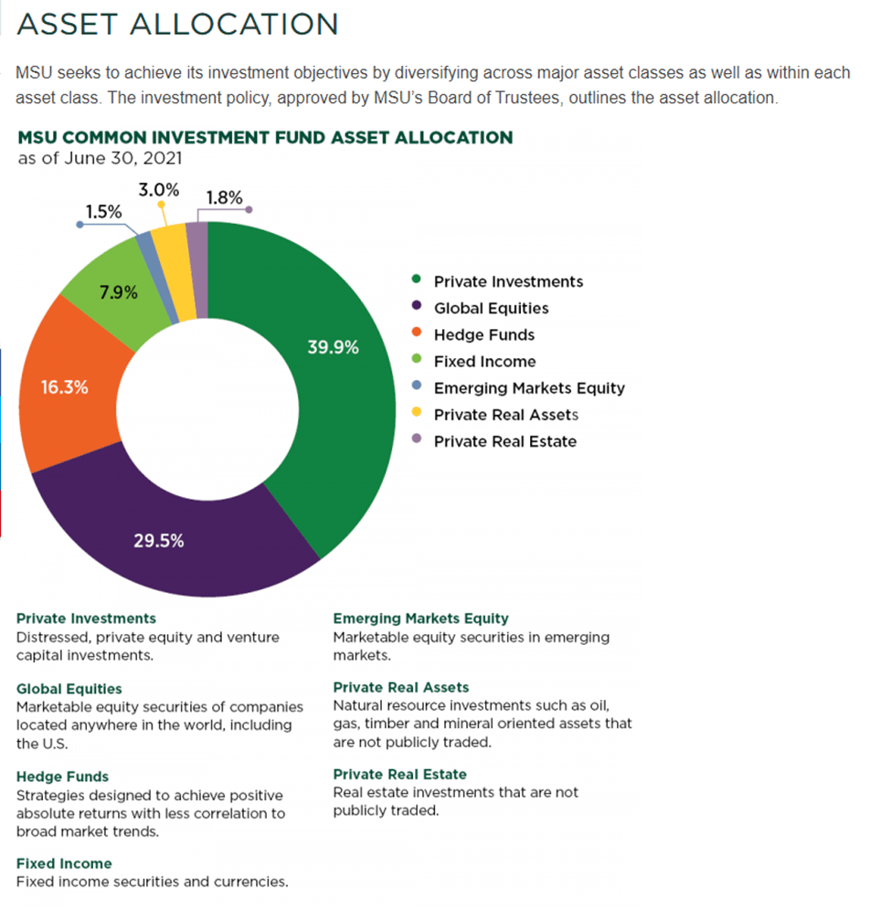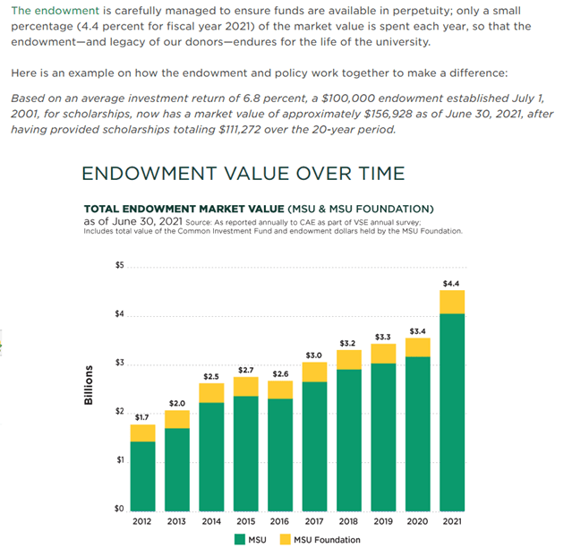With $8.1B in financial assets and a net revenue of $1.1B and a final net position of $5.3B, assets + liabilities (net position after revenues and expenses) give Sparty a $13.4B net worth after 2021 (addendum: potential in net worth by asset type is 13.4B and uncommon, actual definition of net worth would be 5.3B). That is just through the common university function. Additional comes from donor-funded endowments such as Common Investment Funds (CIF), and donors. Again this is a common misconception that universities use to tie endowment money strictly to donor investment and its benefits. Not the case considering endowments are an intricate web of money to operate the whole of the university. With that said, universities target donors, not because donor endowments are done out of the goodness of someone’s heart for education, but because they are investments to build upon for an individual ROI.
