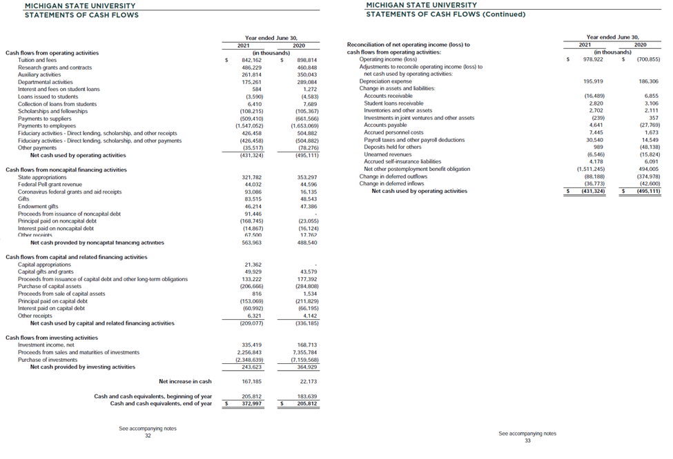 Absurdities aside, let’s get into the nitty-gritty. Page 30 has a breakdown of the revenues compared to expenses. Some items that stand out are that tuition was the main operating revenue and the highest expense went to professors and research projects. You can decide if that is fair, but it seems like the basic model, you pay for an education, and I get paid to teach you and advance society through research. One item of interest is the apparent negative expense (meaning a positive) for post-employment benefits lowering overall benefits to make up lost operating income to covid this essentially led to MSU doubling their net position YoY 2020-2021. The real interesting stuff is the cash flow summary on pages 32 and 33.