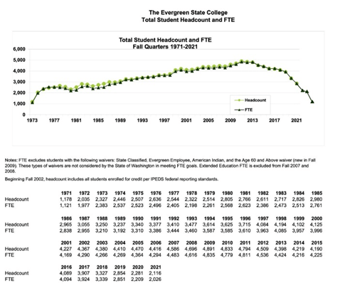 The data displayed on a graph is shocking, as the current enrolment in 2021 seems to have dropped anywhere from 45% – 53% since the issues in 2017 (see graph below). In a way Evergreen has been proving my thesis wrong as pandering to these students did not achieve retention and enrolment, perhaps it is a sign that prospective students are more adept at the role universities are playing and making informed decisions against the cultural insanity of today’s universities.
