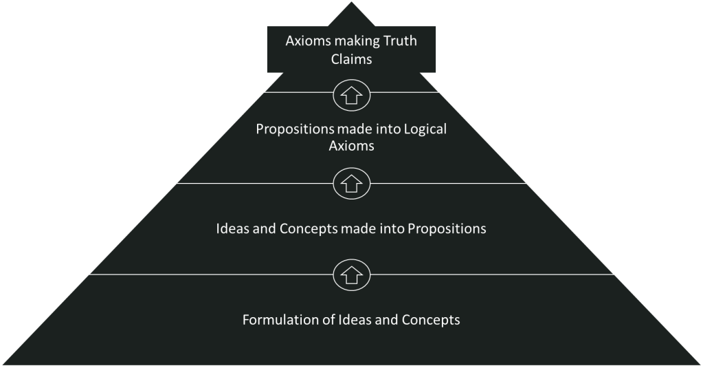 The process of formal logic and propositional logic can be described as an inductive taxonomy, or a framework built upward, toward understanding how analytic epistemology is done. We can start at the bottom with the formulation of ideas, sayings, and concepts into workable propositions to create axioms and eventually truth claims. As shown below, many ideas can be formulated – but must be put through the process of analytic epistemology to be proven as truth in knowledge.