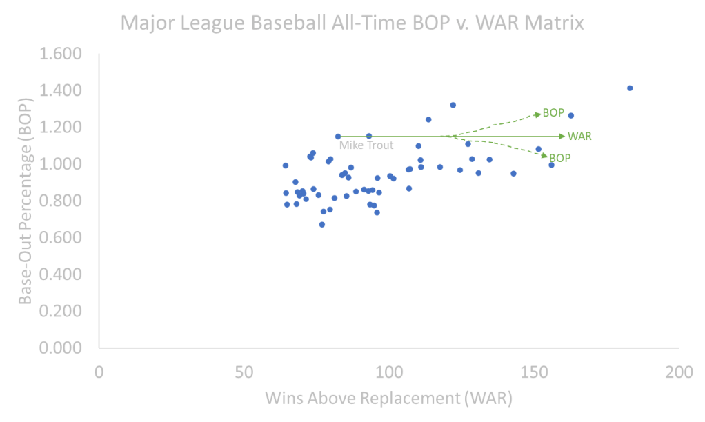Something interesting seems to happen the lower WAR numbers get, the more dispersed the BOP numbers appear. For example, Cal Ripken Jr. has a higher WAR (95.9) compared to Mike Trout (82.4); however, Trout is supreme with a higher BOP (1.150) compared to Ripken Jr. (.735) – what is a contributor to this? The answer is found in the BOP-specific statistics such as Mike Trout already has a career of 204 stolen bases compared to Ripken Jr’s 36 stolen bases. Also note, Trout has only been caught stealing 37 times compared to Ripken Jr’s 39 times – making Trout a net +167 on the base paths and Ripken Jr. a -3. Or even consider the great Willie Mays who boasts a 156.1 WAR – good enough for 3rd all-time – compared to Trout; however, Mays only carries a BOP of .993.