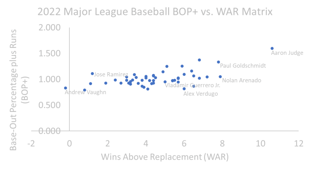 We see anomalies like Aaron Judge leading the pack far and above with WAR and BOP, considering his historic season, with a .311 BA with an OPS of 1.111, 62 HR, and 131 RBI – leading to an American League MVP award. We also have National League MVP Paul Goldschmidt score high on the matrix batting .317 with 35 HR, and 115 RBI. Even though BOP acknowledges ‘the unknown stat’ it still takes into account power numbers, considering these numbers raise key BOP stats such as TB and BB (many power hitters draw walks).