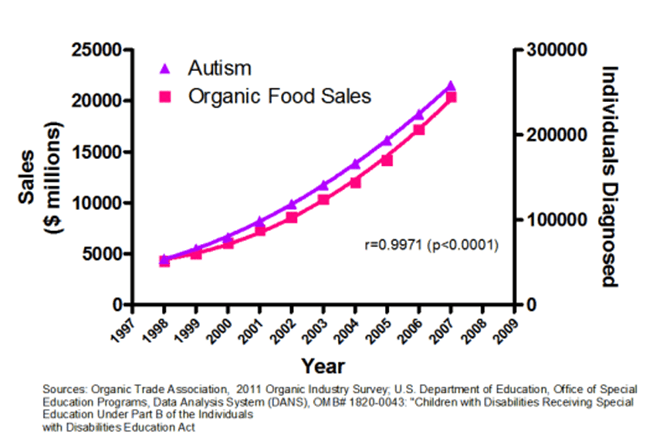 One could make a case for that, but they would run into the problem of reverse inference, such as, do heightened ice cream sales lead to shark attacks, or do shark attacks lead to heightened ice cream sales? Are sharks acquiring a taste for digested ice cream in humans, or does a shark bite lead to an increased desire for ice cream? From one corollary graph, you can deduce the inferences are absurd. Let’s try one that is a little more challenging. A study done by the Organic Industry Survey, and the U.S. Department of Education produced a graph that shows a strong correlation between Organic Food Sales and Autism.