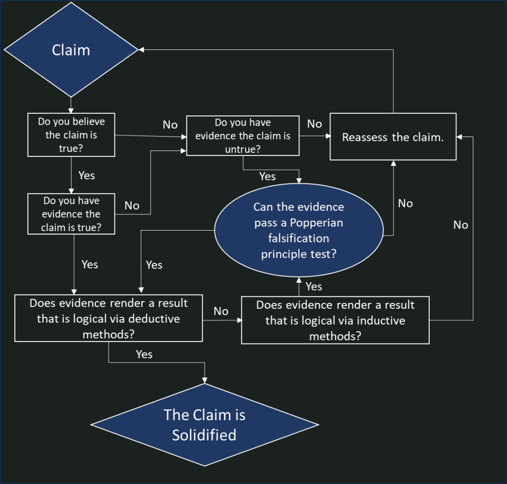How might this be reconfigured for truth? Well instead of starting with a complex problem, we can start with a complex claim that we believe to be true or untrue. The next stage is finding the evidence related to your decision of truth and does it eventually passes a falsifiability test toward a deductive logical conclusion. If it is unable to do so, the claim must be reassessed. Below is a diagram outlining this path.