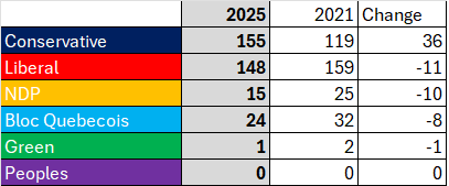 In changes from the 2021 election, I predict the Conservatives will pick up 36 seats with strong showings in British Columbia, and an above-average performance in Ontario. The Liberals will lose 11 seats, which is not so bad considering they were the government in power during the tumultuous economic decade. Big losses from the NDP losing close to half their seats, and losses from the Bloc with a Liberal surge in Quebec. The Greens will lose one seat (Elizabeth May due to redistricting), and the PPC will have 2 elections in a row with no seats gained.