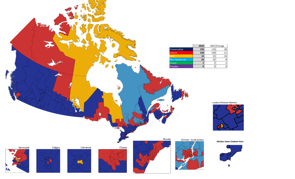 In creating this map and election outcome, I used polling data, Monte Carlo simulations, and recent election trends to predict that Pierre Poilievre and the Conservatives will win the election, but will not gain a majority in the House of Commons. With 155 seats, this is 17 seats short of gaining a majority. The Liberals will be the official opposition party with 148 seats; in third, we have the Bloc Québécois with 24 seats, the NDP drops significantly, but still maintains party status with 15 seats. The Greens keep 1 seat with both their party leaders, Pedneault and May, losing their seats – the Green Winner will be incumbent Mike Morrice in Kitchener Center.