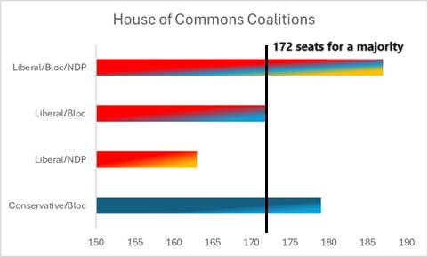 Given that it will be a minority government, one must discuss certain coalitions that will form when legislative bills come to the floor. Even with a predicted Conservative victory, Poilievre will struggle to get his agenda passed, unless he can pull Bloc MPs. For example, Poilievre has wanted to unleash the energy production power that Canada has; unfortunately, Carney, Singh, and Blanchet have promoted carbon taxes to address the “existential threat” that is climate change. The Liberals – along with the Bloc and NDP – can vote down any legislation that would promote new pipelines.